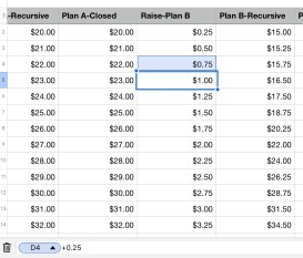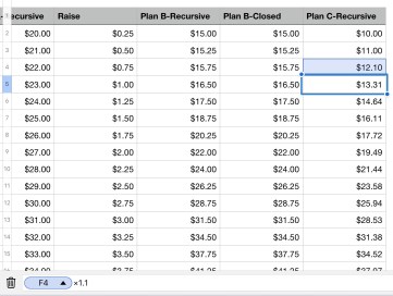 When I originally looked at this plan, I was honestly a little intimidated by what it was asking. But with some perseverance, I stuck it through until the end. Let us begin. I started by analyzing “your first raise is $0.25, and each month it increases by $0.25”. What this says is, after your initial value of $15 month 0, month 1 will increase by $0.25, thus becoming $15.25. Now here’s where most people will get confused, after the first raise of $0.25, the next raise is adding $0.25 to the previous one. I found creating a Raise column to be very beneficial. In your first cell, start with $0.25. The next cell will be $0.25 plus the previous cell. Refer to image on the left. Once again, this uses a recursive formula.