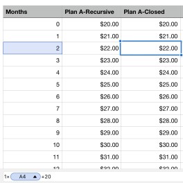 plan a recThis plan says beginning at month 0, your parents give you an initial amount of $20, given you are keeping up with your grades sufficiently. I begin my spreadsheet by labeling the next available column “Plan A”. In the first cell, I entered the initial amount of $20. Since the plan says the allowance is increasing $1 each month, in the next cell I used a recursive formula of A2 + 1, to get the next value of $21 for month 1. The picture on the right depicts the recursive formula. Analyzing Plan A, I realized the pattern is increasing at a constant rate, which is the definition of a linear function, therefore it’s linear. The closed formula for a linear function is y = initial amount + the difference×(month). That is, in the case of Plan A, the closed formula (image below) is y=$1n+$20, since $20 is the initial value and $1 is the difference. If you were to graph this, the line would be straight line with a slope of 1 and a y-intercept of 20. Continue scrolling to question #2 to view the graph.