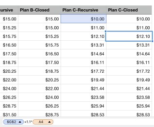 Since including the Raise column, the recursive formula for Plan B is very simple. The initial value for month 0 is $15 (given in the instructions). The next cell is going to be the initial value plus the first raise. The recursive formula is $0.25n+a_(n-1). An easier way of writing this is the previous amount plus the corresponding raise for that row. See the image on the right. I noticed this plan is growing at a linear rate of change with a first initial difference of $0.25 and a second difference of $0.25, thus making this a quadratic function. The general closed formula for a quadratic function is second difference× n× (n-1)/2 + initial first raise × n+ initial amount. That being said, the closed  formula (image below) will be: Image-15. When you look at the image you will see some cells with dollar signs with it. That is to lock in that specific cell. Once again, when you graph this function you will get a parabola. Scroll to question #2 to view image.