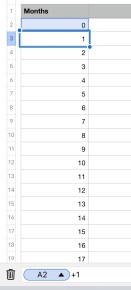 Since the first question tells you to set up a spreadsheet, I decided the Numbers App would be the most beneficial tool for this mathematical problem. It helps with organization and is very easy to use. First, I began by opening the Numbers app on an ipad and creating a new spreadsheet. I created the first column, Months, beginning with 0. In the next cell I typed in the cell before it (cell A2) and added 1 to it. I proceeded to auto fill all the way to month 30. The image to the left shows the recursive formula used to auto fill the month column. Let me take a moment and explain what recursive means. It is defined as “having an initial value and  using the preceding term to define the next term of the sequence” (Krebs).